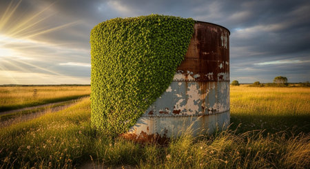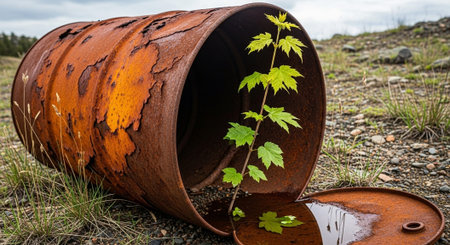 A rusty metal drum sits isolated on a vivid red earth, surrounded by patches of dry grass and stones. This desolate environment captures the essence of abandonment and solitude.