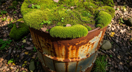 the yellow barrel of waste has long been abandoned in the forest. the concept of improper handling of hazardous waste, violation of the environment, danger to nature.