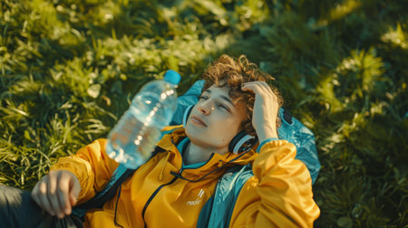 A man wearing headphones peacefully lounges on the ground next to a water bottle.