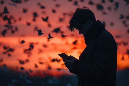 A contemplative figure in a hooded jacket gazes at the fiery horizon, with the city's gentle blur amplifying a serene, introspective atmosphere.