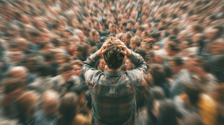 A person stands with hands on their head, surrounded by a large crowd in a busy public setting. The atmosphere is chaotic, conveying feelings of stress and confusion.