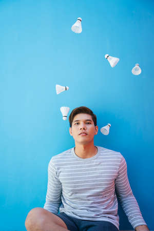 Handsome young asian thai man throwing shuttlecocks up in the air. Male juggling shuttlecock. Over blue background.