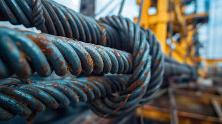 A macro view reveals the intricate details of a heavy-duty steel cable, its twisted strands showing signs of rust and wear.