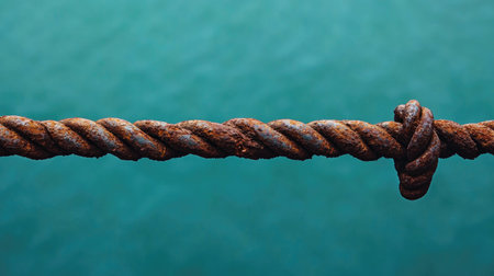 A close-up view of a weathered, rusty rope against a backdrop of serene turquoise water, showcasing intricate textures and colors in nature.