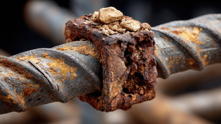 This close-up image captures a piece of rusty metal rebar showcasing its textured surface, highlighting decay and corrosion due to environmental exposure.