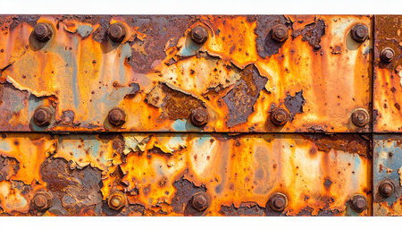A close-up of heavily rusted metal plates with peeling paint and numerous bolts, displaying vibrant orange and teal colors.