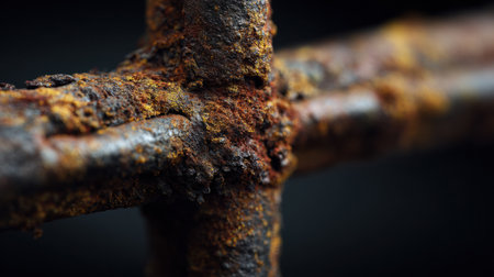 Artistic macro photograph highlighting intricate rust patterns on metal bars. The image captures the texture and decay in a dark, minimalist environment, emphasizing aging.