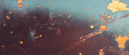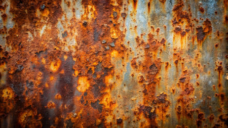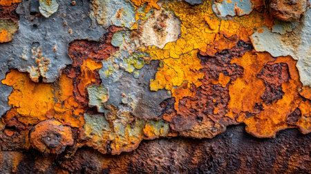This close-up showcases a metal surface with significant wear and tear. The color palette features a mix of rusty oranges, yellows, and browns. The textured composition reveals the effects of time and environment. This image is suitable for various commercial uses, including website backgrounds and design elements.
