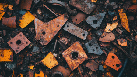 Captivating close-up of assorted rusty metal scrap pieces, showcasing unique shapes and vibrant colors against a textured surface, perfect for industrial themes.