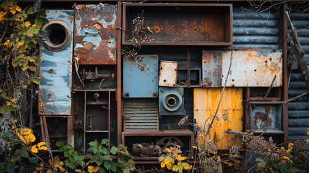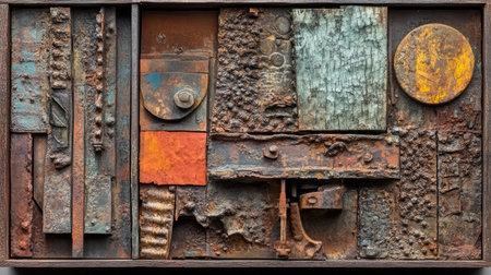 A close-up of a wall constructed from various pieces of weathered metal, showcasing a collage of textures, colors, and shapes.