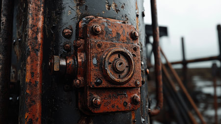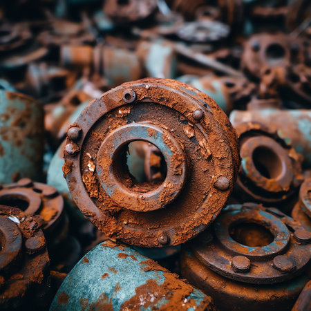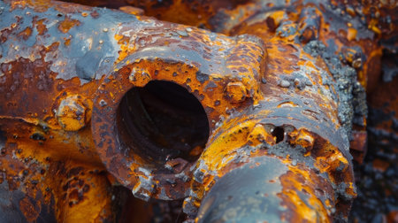Close-up view of a weathered and rusty pipe fitting, revealing the intricate textures and colors formed over time in a derelict industrial setting, whispering stories of past operations.