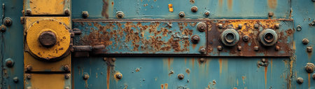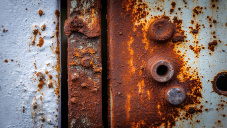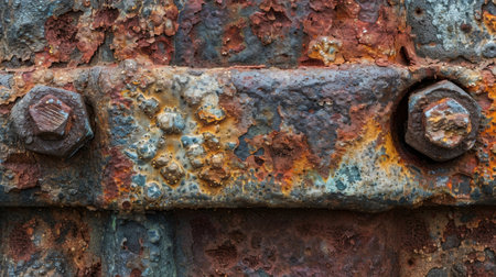 This image captures a detailed close-up of a weathered metal surface featuring rusted fasteners and traces of yellow paint, showcasing industrial decay.