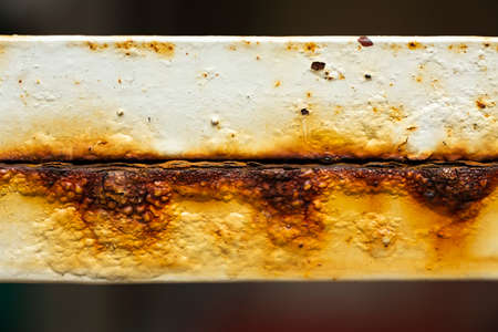 Close-up of rust and corrosion on old white iron, showing the textured decay and degradation of the metal surface.