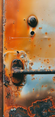 A close-up photo showcasing a rusted metal door with a weathered handle.