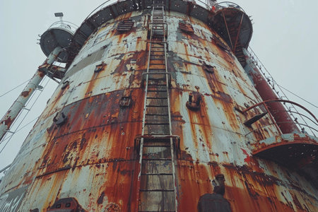 A tall, cylindrical tower, covered in rust and weathering, stands tall against a cloudy sky. A metal ladder runs up the side of the tower, leading to an unknown destination.