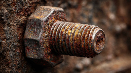 This close-up image captures a rusty metal bolt displaying intricate threaded texture and signs of weathering. A compelling visual for industrial themes.