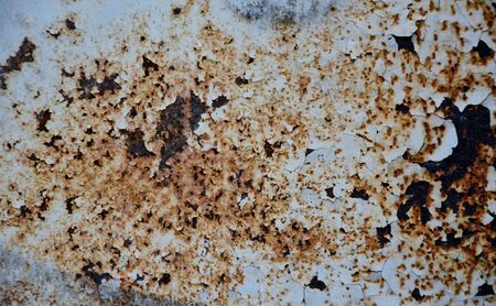 Corroded white metal background. Rusted white painted metal wall. Rusty metal background with streaks of rust. Rust stains. The metal surface rusted spots. Rysty corrosion.
