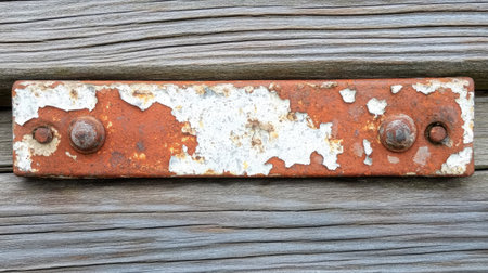 An evocative close-up of a weathered rusty metal strip featuring flaking paint against textured wood, showcasing elements of decay and industrial charm for artistic purposes.