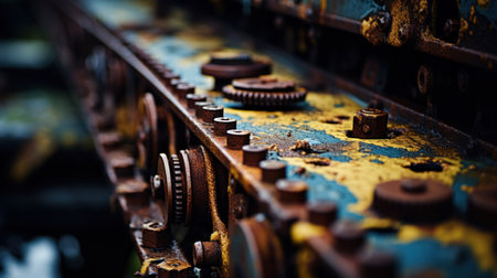 A close up of a rusty old train track with gears, AI