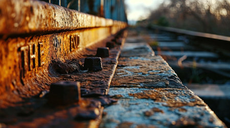 A close up of a rusty old train track with words the end, AI