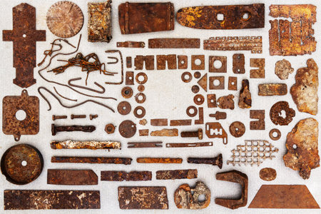 A group of various old rusty bits and pieces arranged on a concrete surface. Old rusty nuts, bolts, nails and other parts flay lay on gray background.