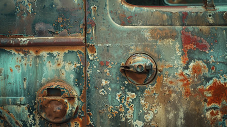 Grunge background of an old, rusted vehicle door, with peeling paint, scratches, and a mix of faded colors.