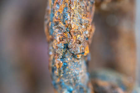 Macro of rusting metal with a peeling paint texture. Rusty metal, old sheet of iron covered with rust with a blue paint.