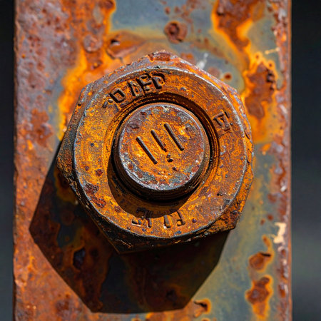This close-up image showcases a rusty bolt embedded in a weathered metal surface, emphasizing the textures and colors of decay in industrial settings.