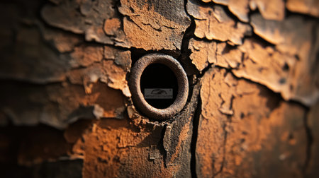 This detailed close-up image showcases a rusty metal surface featuring a circular hole, with cracked paint revealing aging and weathering. The warm tones and intricate texture provide a striking visual appeal.