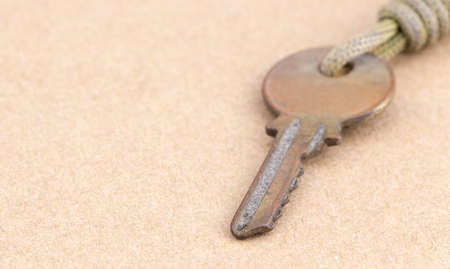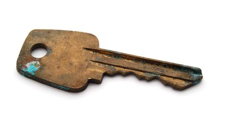 A close-up view of an old, rusty key showing its weathered surface and intricate details. The key lies flat against a plain background, revealing its age and history.