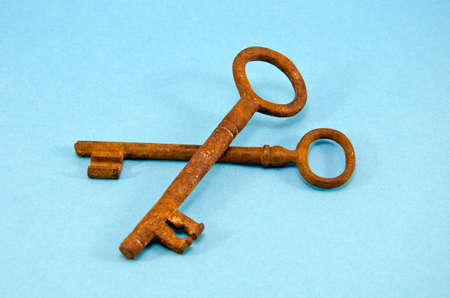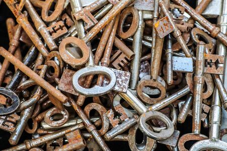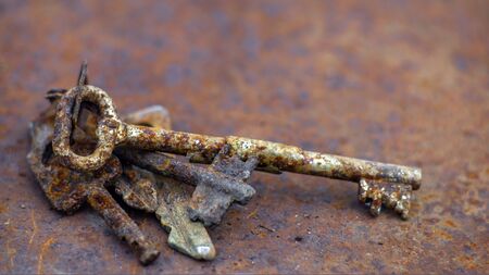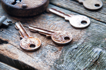 Old rusty keys on a wooden background. Selective focus. Toned.