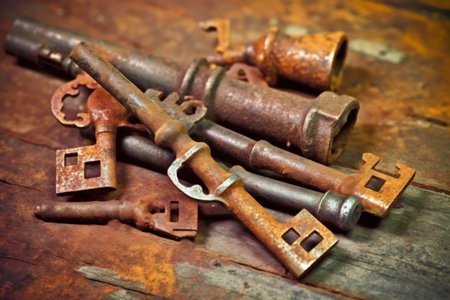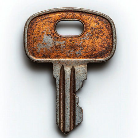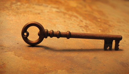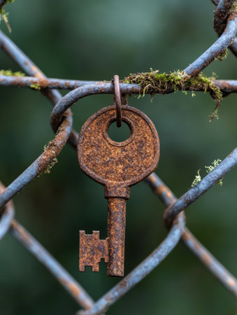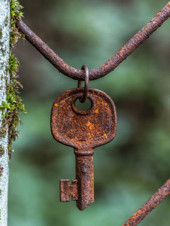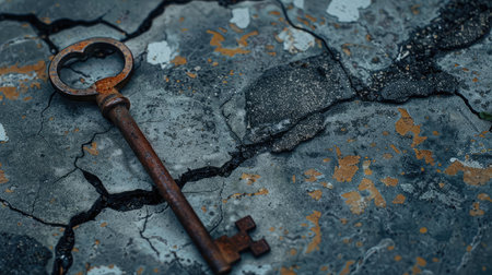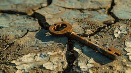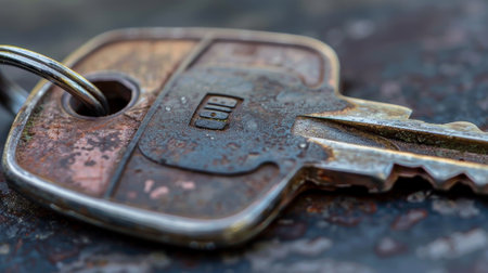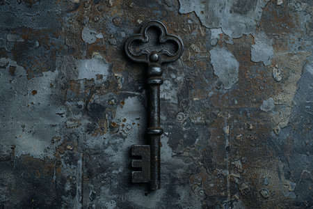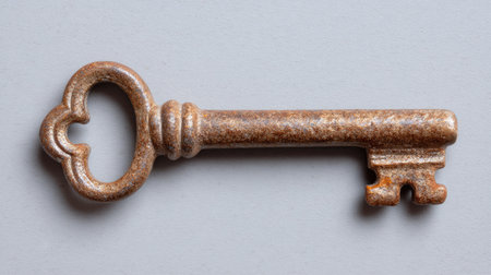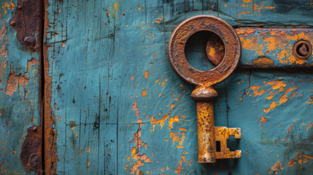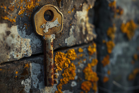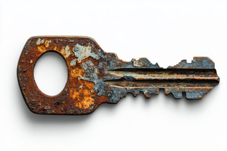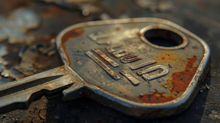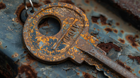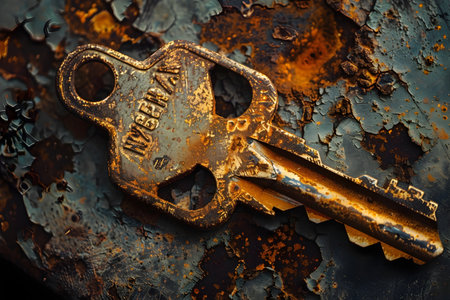 A captivating close-up of a rusted key, filled with intricate patterns and textures, evokes a sense of mystery and nostalgia The key, weathered by time, seems to hold forgotten secrets of an ancient