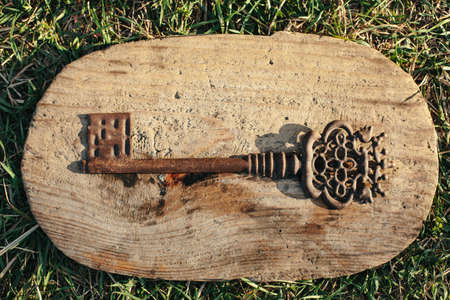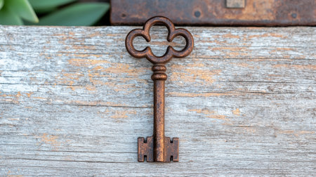 An old rusted key with a looped handle rests on a weathered wooden surface