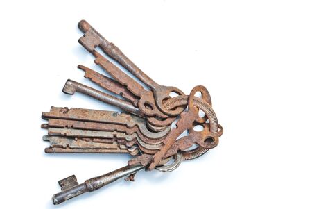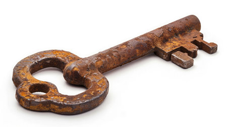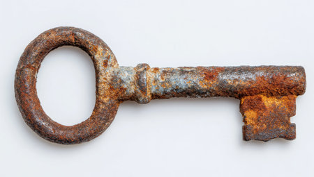 An antique key, heavily rusted, is positioned against a clean white backdrop. The key shows detailed texture and tones of brown and orange from the corrosion. The image is brightly lit, ideal for commercial projects related to history, security, or design concepts, or illustrating themes of time and aging.