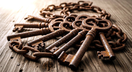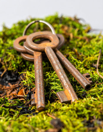 A cluster of old, rusty keys lies forgotten on a vibrant bed of green moss. This image evokes a sense of mystery and discovery, symbolizing lost secrets, hidden treasures, or the key to a new opportunity waiting to be unlocked.