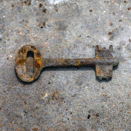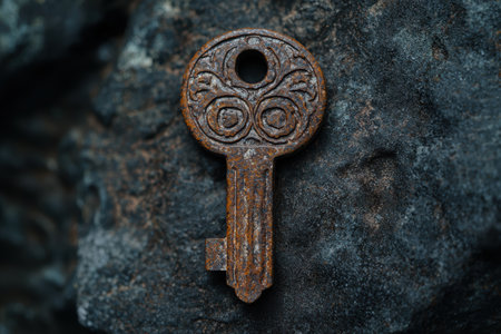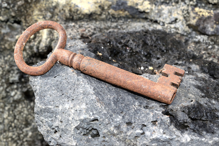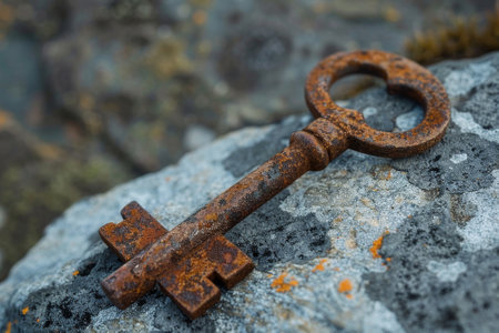 Old rusty key resting on a textured stone surface covered in lichen, representing concepts like history, decay, and the passage of time