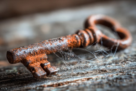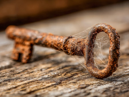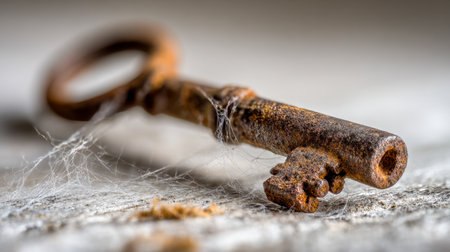 An aged metallic key, corroded with rust, rests on a coarse texture while slender cobwebs wrap around it, evoking stories of bygone eras and hidden histories.