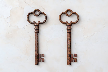 Two vintage iron keys rest against a textured background, showcasing their intricate design and rustic charm, perfect for home decor or artistic projects.