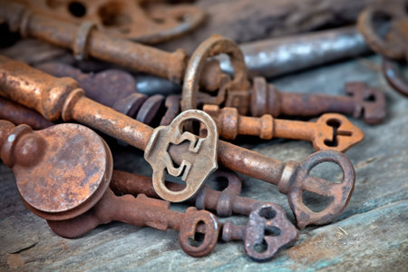 A collection of antique, ornate skeleton keys hangs in a row, their rusted metal telling tales of forgotten doors and locked-away secrets.