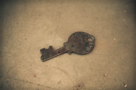 A close-up image of an old, rusty metal key lying on a gravel surface with a shallow depth of field, highlighting timelessness and abandonment.