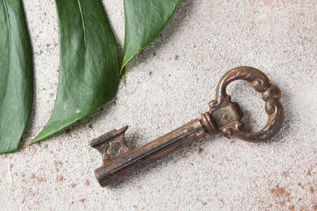 Close-up of an antique iron key on a textured surface, highlighting its age.
