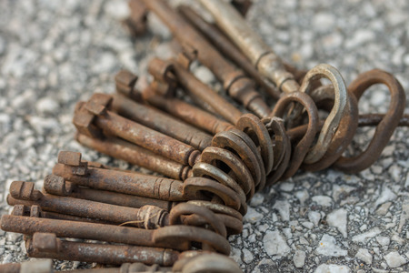 Various old keys on weathered iron ring set against textured surface. Concept Vintage Keys, Iron Ring, Textured Surface, Antique Collection