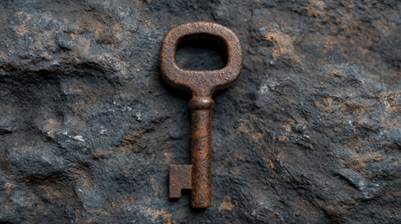 A weathered, rusty key is displayed against a backdrop of dark, textured rock. The image captures the essence of age and forgotten stories, inviting intrigue and exploration.
