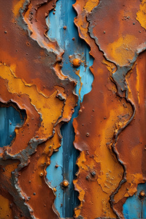 This close-up showcases a metal surface with significant wear and tear. The color palette features a mix of rusty oranges, yellows, and browns. The textured composition reveals the effects of time and environment. This image is suitable for various commercial uses, including website backgrounds and design elements.