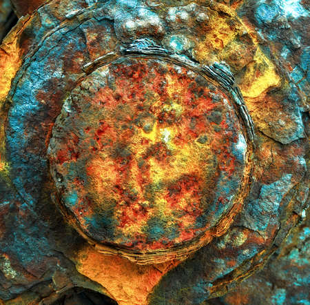 A close-up of heavily rusted metal plates with peeling paint and numerous bolts, displaying vibrant orange and teal colors.
