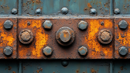Industrial metal background with rusted textures, rivets, and worn steel plates. The rugged, gritty look adds a sense of toughness and durability, ideal for industrial themes