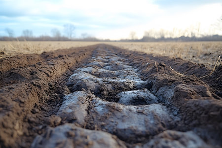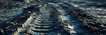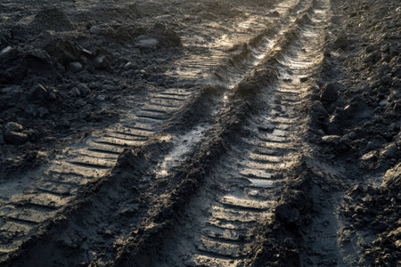 Tire tracks carved into wet soil show recent activity in a rural area at dawn near farmland, highlighting the texture of the earth.