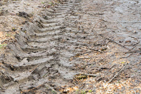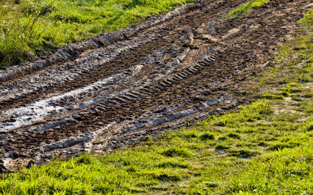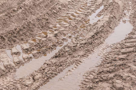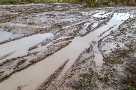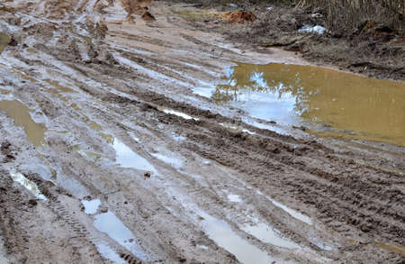 Dirty broken road from big rubber tires of car, tractor and tank. Dirty liquid puddle after rain at the base of the season