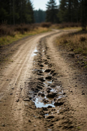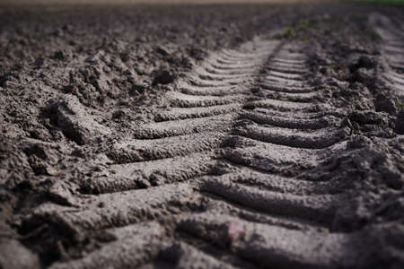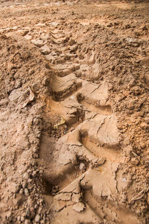 dirty clay mud road with tire tracks - closeup with selective focus and blur