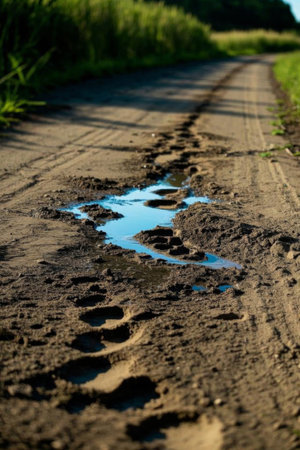 Broken dirt road after heavy rain. Swampy lagoon of a road demonstrates the most common problem in maintaining rural roads